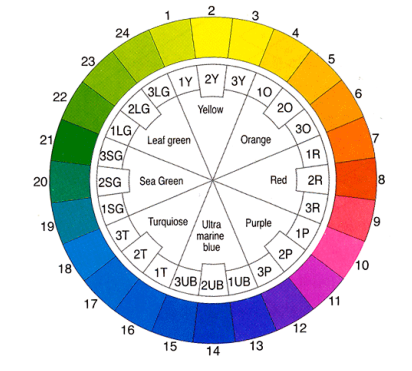 - 기본 10색 : 빨강(R), 노랑(Y), 녹색(G), 파랑(B), 보라(P), 주황(YR), 연두(GY), 청록(BY), 남색(PB), 자주(RP)