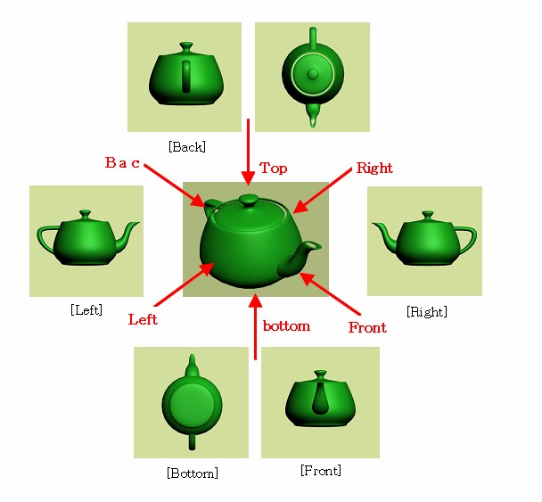아래 그림과 같이 물체를 바라보는 방향은 Front, Back, Left, Right, Top, Bottom의 6개가 존재한다.